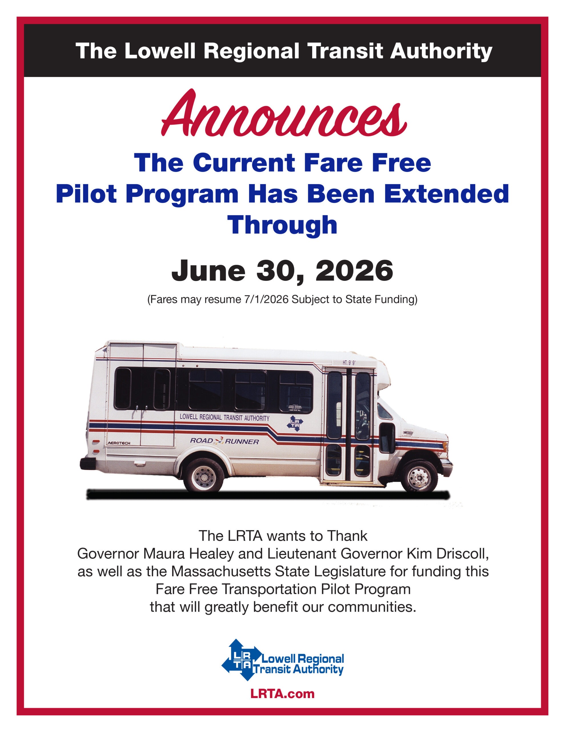 The LRTA wants to Thank Governor Maura Healey and Lieutenant Governor Kim Driscoll, as well as the Massachusetts State Legislature for funding this Fare Free Transportation Pilot Program that will greatly benefit our communities.